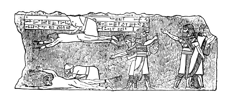 The image shows Assyrians Flaying Prisoners Alive. It is also called as colloquially known as skinning. It is a slow and painful method of execution in which the skin is removed from the body, vintage line drawing or engraving illustration